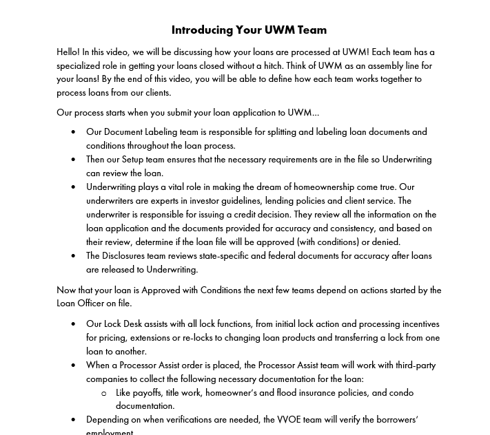 This video shows how loans are processed at UWM. By the end of this video, learners are able to define how each team works together to process loans from brokers.
